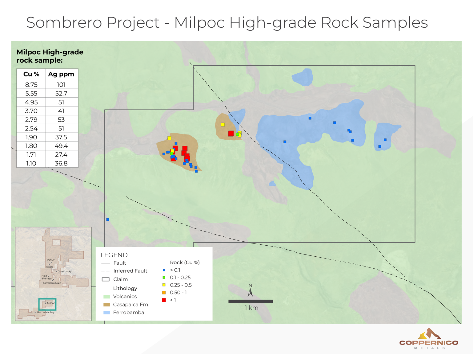 Milpoc also has elevated copper and gold values in stream sediments. Cursory mapping and sampling in 2018-2019 by Coppernico geologists identified copper-oxide mineralization occurring parallel to and within bedding in the Casapalca formation sediments. Several grab samples from Milpoc returned high-grade copper values between 8.75% and 1.71% along with silver values from 101 g/t to 41 g/t (Figure 3. See news release dated October 17, 2019).